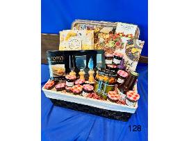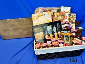 Charcuterie board, covered charcuterie board, charcuterie book, serveware, assorted jams, honey, kitchen towels, pickles and $50 Bizios Fresh Market Gift Card