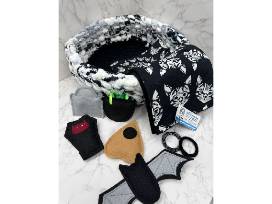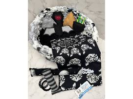 Emo cat starter kit includes Chonky Bed, self-heating mat, catnip-stuffed Rattlin Coffin, catnip-stuffed Crinkle Bat, catnip-stuffed Planchette, catnip-stuffed Cauldron, catnip-stuffed Headstone, kicker, XL catnip kicker with ribbons, two (2) milk rings