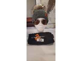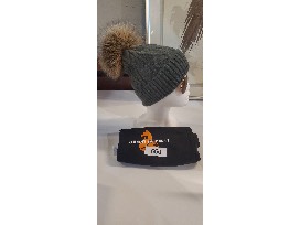 Cross fox fur puff hat with varmint garments leather logo. Puff is removable via snap style button.