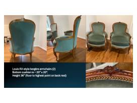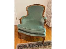 1Three (3) French Louis XV-style bergère armchairs, carved walnut frames with green velvet upholstery. French Louis XV-style bergère armchair, carved walnut frame with green velvet upholstery.