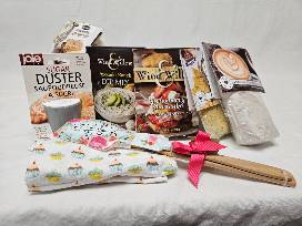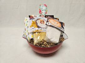 Creo red bowl, sugar duster, cupcake flour sack towel, "Its All Good" spatula set, Mexicali dip mix, Snickerdoodle Brewnies mix, Wind & Willow avocado ranch dip mix, Will & Willow strawberry shortcake cheeseball mix, Espresso dip mix.