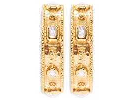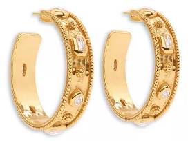 Clean and classic statement hoops wrought in shimmering hammered gold and finished with our iconic berry and thread motif are accented with crystal clear embellishments to sparkle and shine alongside your own inner light.