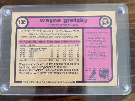 1982 O-Pee-Chee Wayne Gretzky card #106. From Package to protective case. This card is a gem and sells for $23 for fair condition up to $4,590 for mint condition. Come take a look and judge for yourself. This card is a card collectors dream.