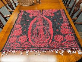 Our Lady of Guadalupe poncho - A devotional garment woven in bold red and black, honoring the beloved patroness of the Americas.