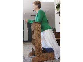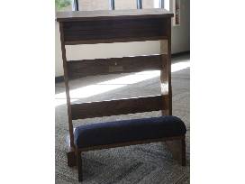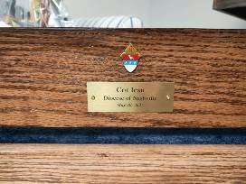Inspired from a request by Fr. Luke Wilgenbusch, this handmade custom kneeler with a fold away cushion is made by Steve Wilgenbusch (his father) specifically and exclusively for this event. It is made of individually selected red oak wood, that is hand sanded, hickory stained, and finished with 3 coats of polyurethane. Inlaid in one of the horizontal boards is commemorative plate and a crest of the Diocese of Nashville.