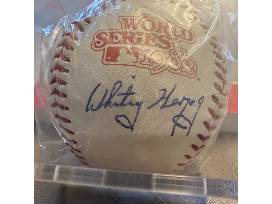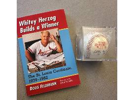 11982 World Series Ball in acrylic case signed by Whitey Herzog and "Whitey Herzog Builds a Winner" book.