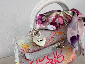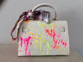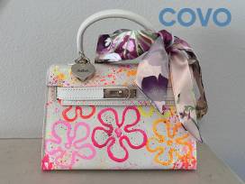 This exquisite hand painted handbag by Anca Barbu from Covo combines timeless elegance with artistic craftsmanship. Inspired by the iconic Kelly Hermes bag, it features a sleek silhouette and a sophisticated, structured design. Each bag is a one-of-a-kind piece, hand painted with intricate, vibrant designs, making it a true work of art. Crafted from premium leather, this handbag is not only a luxury accessory but also a statement of individuality. A must-have for those who appreciate both high fashion and artistic expression. Perfect for elevating any collection or wardrobe. Approximately 9"x6". Comes with a detachable crossbody strap.