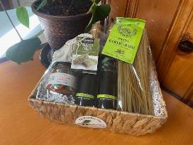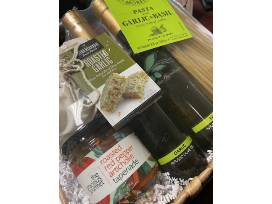 A 200 ml bottle of garlic infused olive oil, a 200 ml bottle of basil infused olive oil, jar of gourmet roasted red pepper & artichoke spread, a Soberdough Brew Bread kit, and package of garlic & basil pasta.