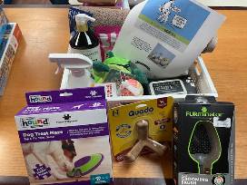 Plus-take home this fun basket of dog supplies including doggie toys, shampoo, grooming supplies, and treats!