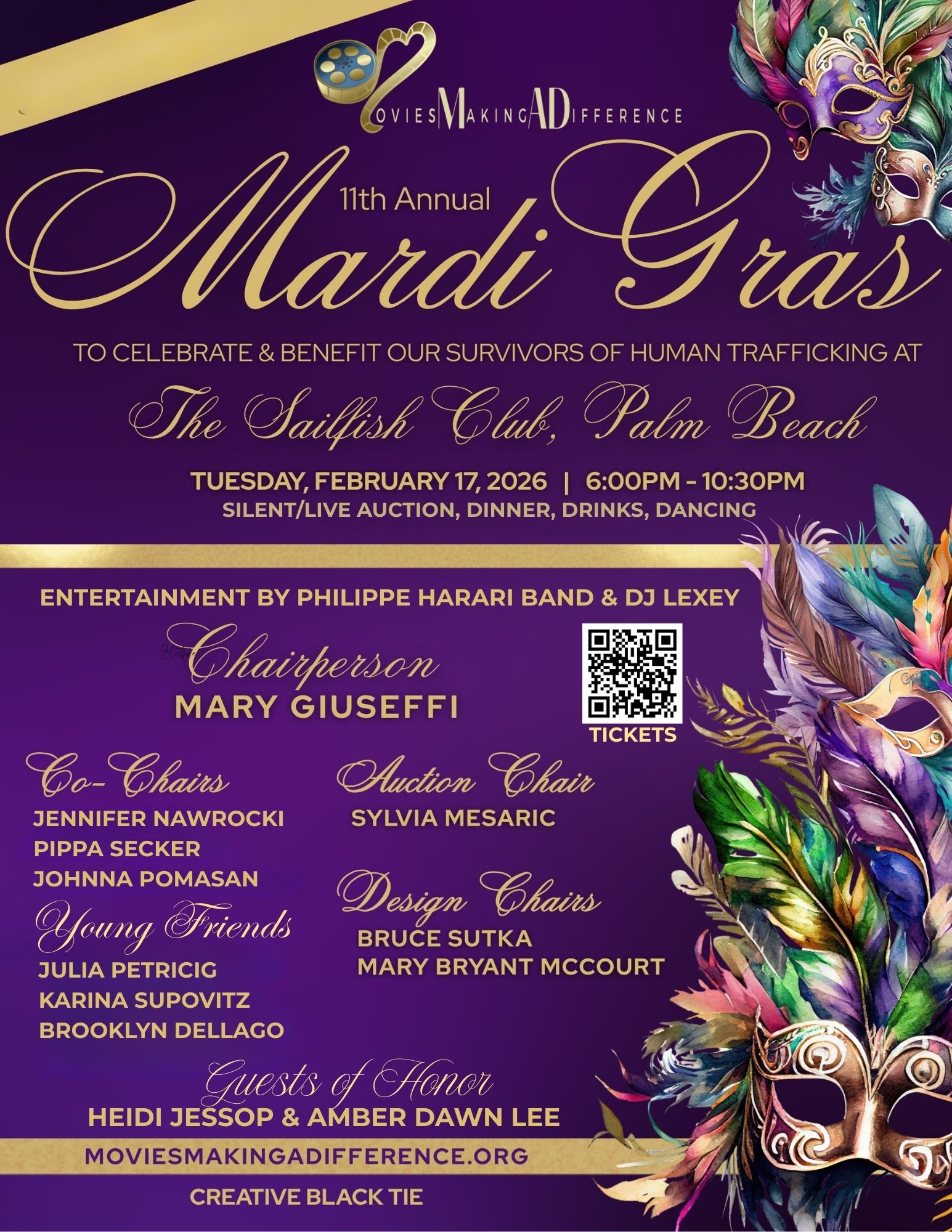 A perfect setting at the beautiful Sailfish Club along the Intercoastal on Palm Beach Island. Use your creativity to dress in your Mardi Gras best to help us Benefit and Celebrate our Survivors of Human Trafficking.You'll be kicking off a lively evening with fabulous DJ Lexey on electric violin during a festive cocktail reception with light bites and silent auction.