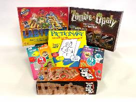 Board games sprawled, cards in hand