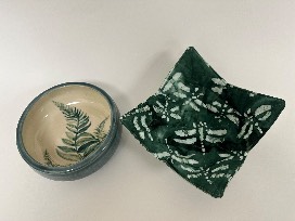 Handcrafted in the Cape Cod Museum of Art's pottery studio by our very own amazing group of potters. Hand painted, one of a kind, paired with a custom made quilt reversible koozie hand made by Cynthia Klopfer.