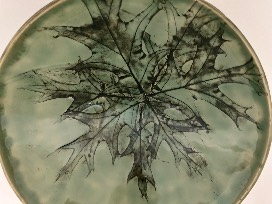 Handmade by the Mangia Pottery Group. Embossed ceramic bowl using the CCMoA elements of nature, oak leaves.