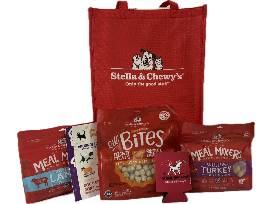 Surprise your dog with this package that includes an XL 44" x 32" EHEYCIGA Orthopedic Dog Bed in light brown that's good for dogs up to 100lbs., a Stella & Chewy insulated bag filled with a 3.5 oz bag of Tantalizing Turkey Meal Mixers (Expires January, 2025), a 3.5 oz bag of Dandy Lamb Meal Mixers (Expires December, 2025), a 7 oz bag of Itty Bitty Beef Recipe lil' Bites (Expires June, 2025), a Stride with Pride can koozie, 2 sheets of Stella & Chewy's stickers and 4-pack of Kong Cozie toys that includes Freddy Frog, Tupper Sheep, Nate Lion and Floppy Rabbit.