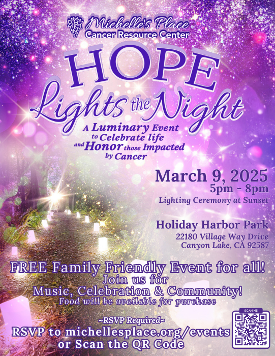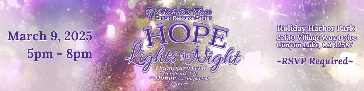 You can still donate!Join us for "Hope Lights the Night" a Luminary Event, on Sunday, March 9 from 5pm - 8pm at the Holiday Harbor in Canyon Lake! This luminary celebration is hosted by Michelle's Place Cancer Resource Center and the Canyon Lake Mermaid Club.