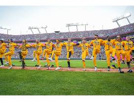 The Savannah Bananas list their game as we play Banana Ball- the fastest and most entertaining game of baseball. Our players perform choreographed dances every game - Taylor Swift, Morgan Wallen, Mariah Carey - You name it, they've danced to it. Every game we have a 3-2-2, which stands for 3rd inning, second batter, second pitch. These are unique in-game pre-pitch dances that have combined together for over 300 million views on TikTok. We are the only baseball team to play in kilts. That's right, kilts. Our players perform in over-the-top music videos like Old Town Road, Can't Stop the Peeling, and I Don't Dance. Our hitters walk-ups are legendary. Bananas may be escorted to the plate by the Banana Pep Band, walk down the yellow carpet wearing the finest Dolce and Banana, or they may even introduce themselves. We are known for our epic scoring celebrations. From running through the crowd to performing fully choreographed country line dances. When we score, you never know what will happen next. We have the World's Tallest Hitter and Pitcher with Dakota "Stilts" Albritton who stands 10 feet tall.