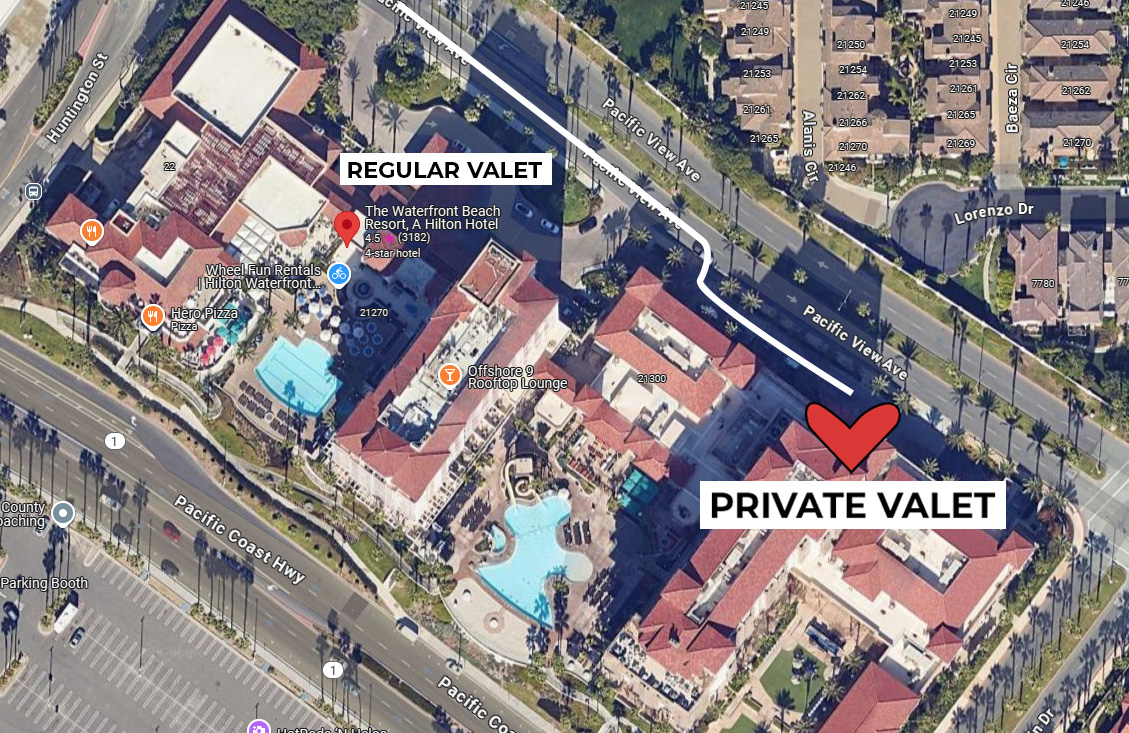 From Pacific View Ave, take the third entrance on the right to access our Private Valet area