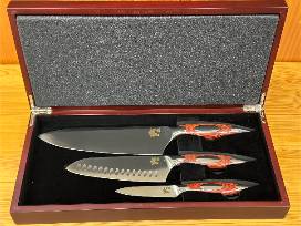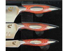 The ultimate Rhineland chef set! 8" French chef knife, all purpose knife, great for fruits vegetables and meats. 6" Santoku knife for more precise cuts. Paring knife for peeling and garnishing.