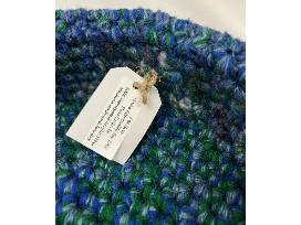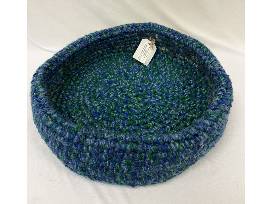 medium, blue and green Pet Bed. Made with repurposed yarn 100% Acrylic. Machine wash and dry. Handcrafted with love by Pearl, 97 years young!