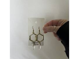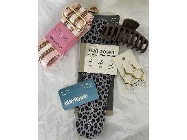 Gift bag including Jen & Co Pocketbook/Guitar strap, Leopard pattern Flat Socks, Hair clip, and Polygon shaped gold earrings with clear beaded earrings.
