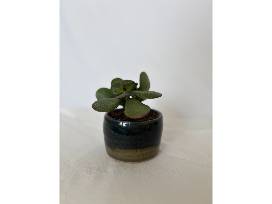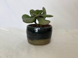 Take home your very own handmade planter by LHS's Claire LeFew with a succulent jade plant. This planter has beautiful blue and green glazes and is about 3 inches in diameter and 2 inches tall.