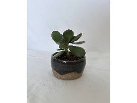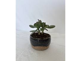 Take home your very own handmade planter by LHS's Claire LeFew with a succulent jade plant. This planter has beautiful blue glaze in a wavy pattern and is about 3.5 inches in diameter and 1.75 inches tall.