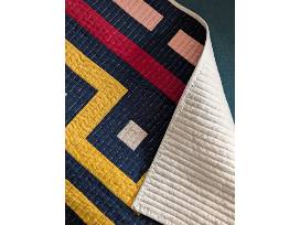 This crib-sized quilt was handmade with love by Waters parent, Natalya Egon. It is 38" x 50" and made with 100% cotton and all natural cotton batting. The design features modern lines of fabric in yellow, red, and pink on a black background with white accents. The quilt is machine pieced and quilted and hand bound.