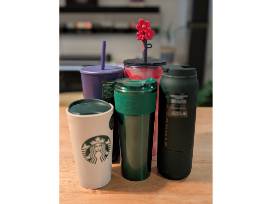 Calling all coffee-lovers! This Starbucks gift bag comes complete with three assorted bags of coffee beans (Sunsera Blend, Italian Roast, and Decaf Pike's Peak) and 5 assorted Starbucks bottles and tumblers.