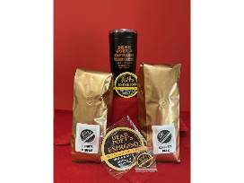 - Dead Poet's Espresso Ltd: 1 lb. medium roast, 1 lb. dark roast, travel mug, merch (key chain, magnet, sticker)