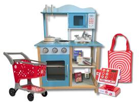 - Includes 2 wood pots with lids and 3 wood cooks tools