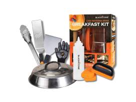 - Blackstone cooking accessories: Griddle spatula, Breakfast kit, oil bottle, baster lid, tongs, scraper, griddle gloves, apron, cleaning brush