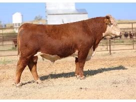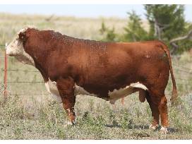 The top selling bull from the Copeland & Sons 2018 Production Sale. A powerful horned herd sire that sires exceptional length of body and thickness in his progeny and his pedigree is anchored by two of the best cows at Copeland, JCS Miss Royalty 4720 "Spot" and JCS Miss Royalty 4751. 7166 sired the $10,000 top selling bull in P&R Herefords 2023 Production Sale, P&R Advancer L 234K (pictured).