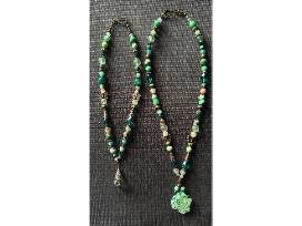 1Two-piece custom statement necklace made by Huckleberry Youth Programs' Clinical Director, Heidi Wells. Set with antique copper with a variscite centerpiece, the piece includes blush and green beads, and glass and crystal stones.