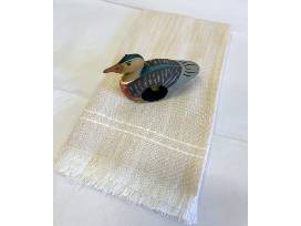 A table setting for 6 with wine glasses, a bottle of wine, and decorative duck napkin rings arranged on a light-green platter.