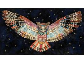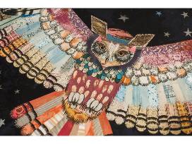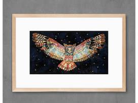 Archival reproduction of original paper collage artwork featuring an owl with stretched wings flying across a star-filled night sky. Signed, limited edition print in wooden frame.