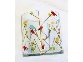 - A cheery clear glass vase, decorated with simple, stylized designs of birds and branches