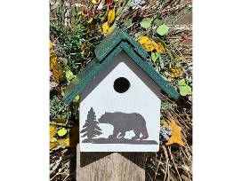 Handcrafted birdhouse by Denver Audubon volunteer, Bob Santangelo. Using 99% reclaimed materials: "Everything is repurposed except the nails.!" A perfect home for chickadees, wrens, or the occasional nuthatch. This birdhouse has a 1 1/8 inch hole (small enough to keep house sparrows out).