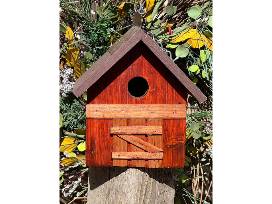 Handcrafted birdhouse by Denver Audubon volunteer, Bob Santangelo. Using 99% reclaimed materials: "Everything is repurposed except the nails.!" A perfect home for chickadees, wrens, or the occasional nuthatch. This birdhouse has a 1 1/8 inch hole (small enough to keep house sparrows out).