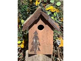 Handcrafted birdhouse by Denver Audubon volunteer, Bob Santangelo. Using 99% reclaimed materials: "Everything is repurposed except the nails.!" A perfect home for chickadees, wrens, or the occasional nuthatch. This birdhouse has a 1 1/8 inch hole (small enough to keep house sparrows out).