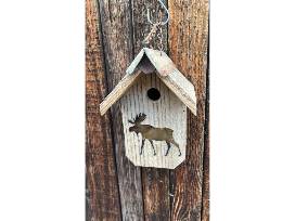 Handcrafted birdhouse by Denver Audubon volunteer, Bob Santangelo. Using 99% reclaimed materials: "Everything is repurposed except the nails.!" A perfect home for chickadees, wrens, or the occasional nuthatch. This birdhouse has a 1 1/8 inch hole (small enough to keep house sparrows out).