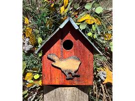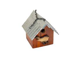 Handcrafted birdhouse by Denver Audubon volunteer, Bob Santangelo. Using 99% reclaimed materials: "Everything is repurposed except the nails.!" A perfect home for chickadees, wrens, or the occasional nuthatch. This birdhouse has a 1 1/8 inch hole (small enough to keep house sparrows out).
