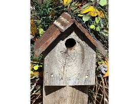 Handcrafted birdhouse by Denver Audubon volunteer, Bob Santangelo. Using 99% reclaimed materials: "Everything is repurposed except the nails.!" A perfect home for chickadees, wrens, or the occasional nuthatch. This birdhouse has a 1 1/8 inch hole (small enough to keep house sparrows out).