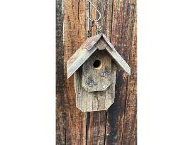 Handcrafted birdhouse by Denver Audubon volunteer, Bob Santangelo. Using 99% reclaimed materials: "Everything is repurposed except the nails.!" A perfect home for chickadees, wrens, or the occasional nuthatch. This birdhouse has a 1 1/8 inch hole (small enough to keep house sparrows out).