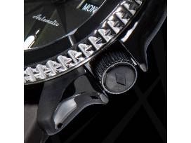 The watch has a black finished stainless steel case with a 24 jewel Seiko caliber 4R36 automatic winding movement, special rotating bezel, and green special exhibition caseback,. The green dial has a sword design that is carried onto the green rubber strap with pin buckle.