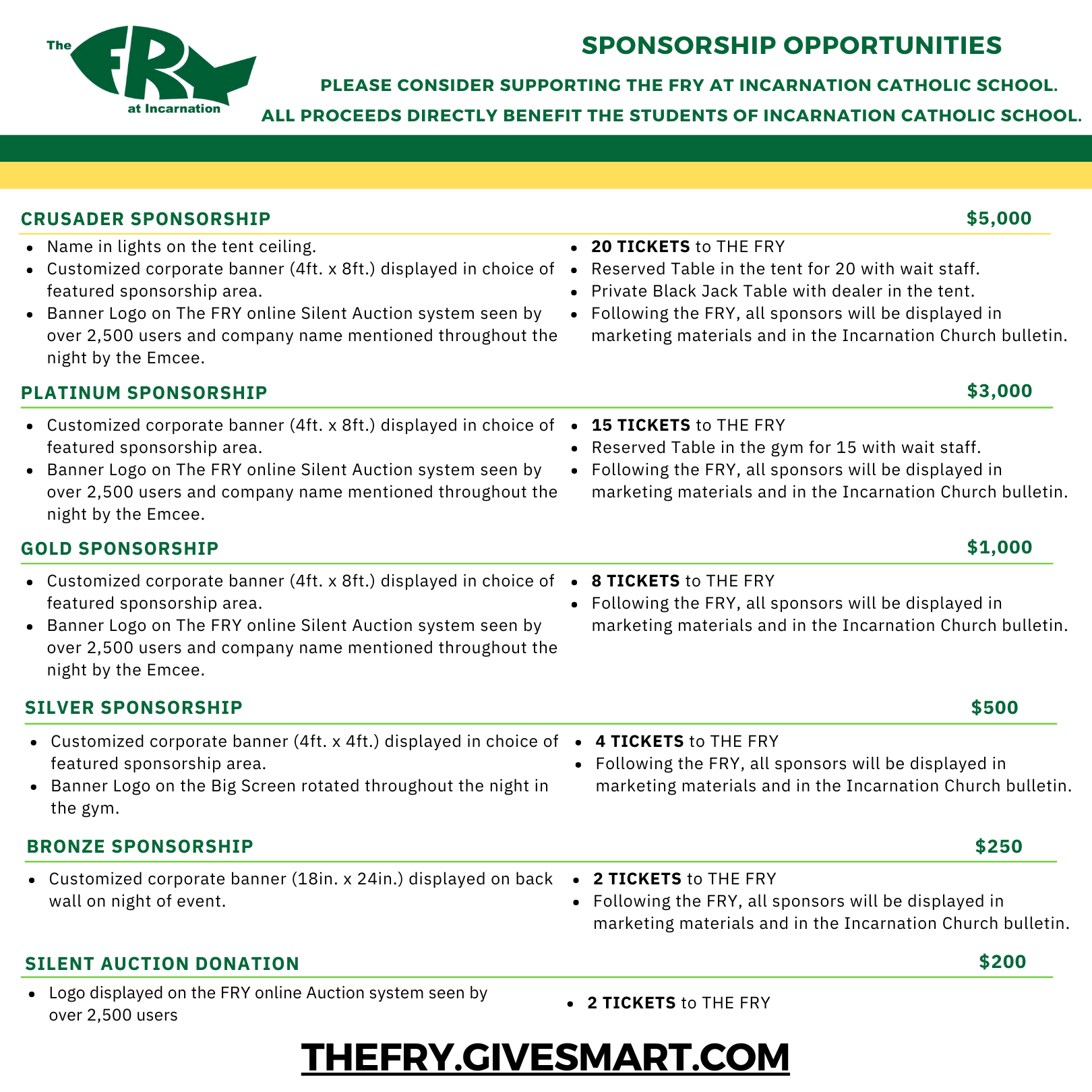 As a non-profit Catholic School, we depend in part on the good will of our community for support and are seeking the support for our annual fish fry. The FRY is one of the most popular events within the community, averaging more than 2500 adults in attendance. All sponsors will be advertised heavily within event materials, church bulletins, and all major displays.