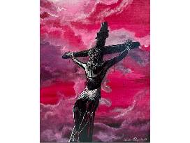 This breathtaking artwork captures a poignant and moving image of Jesus on the Cross, set against a vibrant red and pink sky that evokes both reverence and beauty.