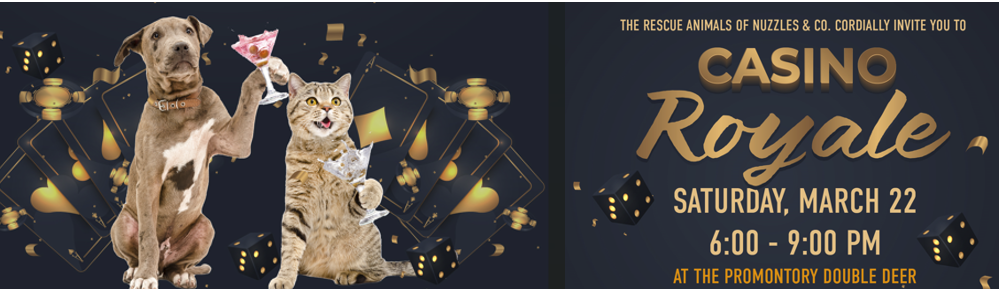 Come take a gamble on love. The rescue dogs, cats, and farm animals of Nuzzles & Co. Pet Rescue and Adoption cordially invite you to a speakeasy-themed evening of casino gaming, signature cocktails, light fare, and puppy snuggles at the stunning Double Deer at Promontory.