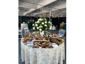 Includes decorative staging with fresh flowers & greenery, plates, napkins, utensils, neutral-colored tablecloth and serving utensils. Table not included. Delivery fee not included. Company located in North Hills of Pittsburgh, please call prior to bidding to ensure location is within delivery range.