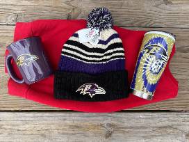 Hey Hon! Don't forget your Ravens gear..... Giant tumbler, coffee mug and a toasty stocking cap in a stadium approved clear bag.