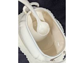 Serve up elegance with this 15" x 12" platter, lidded soup tureen, and matching spoon. A small chip on the lid adds character to this no-maker's-mark piece, but the classic style ensures it remains a standout. Perfect for cozy soups or fancy gatherings!
